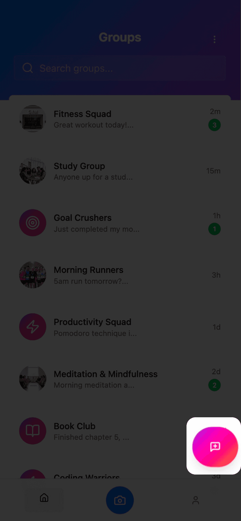 Click home icon→ click group bubble → Add Group name → Add Contacts andJoin → See group feed.