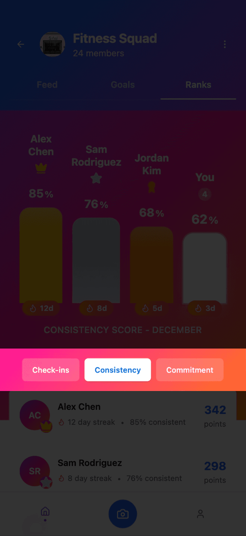 Open group → Open Ranks → View ranks under check-ins, consistency and commitment→ Post updates → See rank improve.